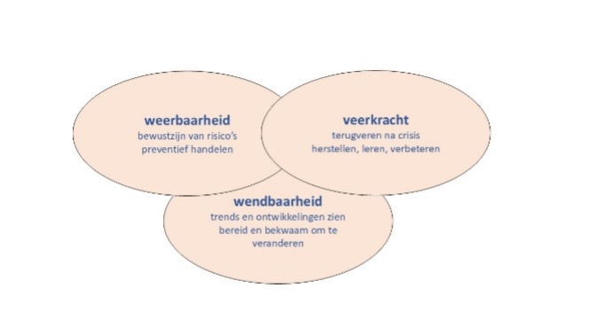 Weerbaar betekent dat we de risico’s van externe gebeurtenissen kennen en maatregelen hebben genomen om de mogelijke gevolgen van die bedreigingen te minimaliseren. Wendbaar houdt in dat we flexibel zijn, ons kunnen aanpassen aan veranderingen en openstaan voor leren en innoveren. Veerkracht geeft ons het vermogen om na een crisis te herstellen en waar mogelijk verbeteringen en innovaties door te voeren.